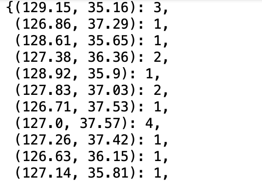 위치가 Key이고 (경도 , 위도) 로 되어있는 튜플입니다.