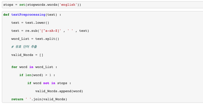 이제 불러온 STOPWORDS를 이용해서 Text를 단어집합으로 바꾸고 해당 단어 집합에서 유효단어 저장해서 새롭게 Text를 만듭니다.
