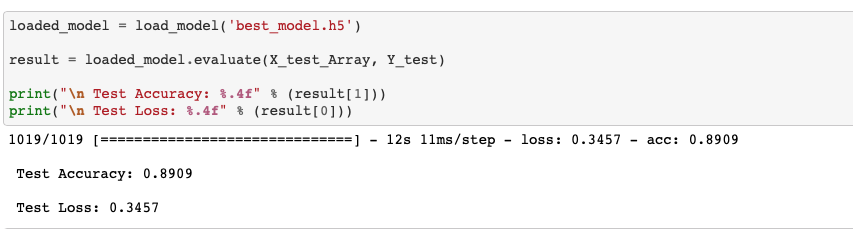 테스트 데이터로 평가한 결과 정확도가 89% 정도 되는 것을 확인할 수 있습니다.