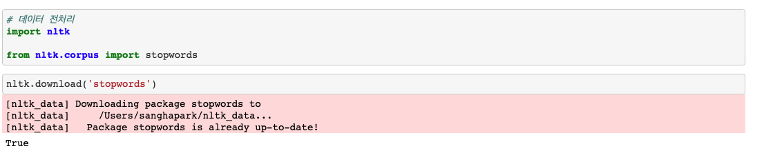이제 Text에서 필요 없는 단어들을 제거하기 위해서 nltk의 stopword 집합을 불러옵니다.
