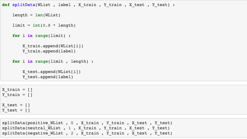 각 label로 데이터를 분할하였으니 각 label 당 데이터를 80% , 20% 나누어서 훈련 데이터 및 테스트 데이터에 저장합니다.