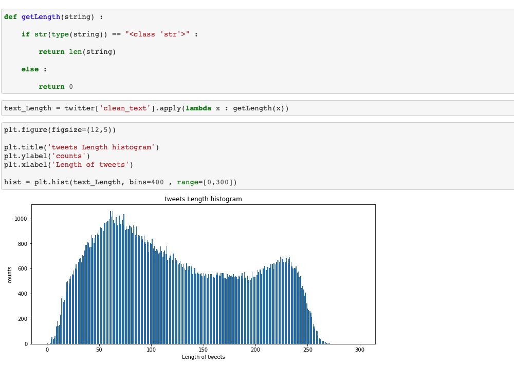 히스토그램을 보면 트위터의 길이가 대략 50~80 구간이 가장 많은 것을 확인할 수 있지만 대략 230까지 비교적 골고룩 분포하는 것을 확인할 수 있습니다.
