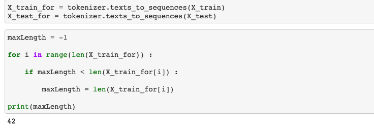 해당 토크나이저를 이용해서 훈련 데이터 및 테트스 데이터를 변환하고 훈련 데이터의 최대 길이를 파악합니다.